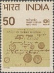 50-paise stamp depicts several coins;