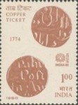 1-rupee stamp depicts 2-anna copper coins of 1774.