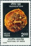 2-rupee postage stamp depicts a Yaudheya tribal republic copper coin from around 200 BC.
