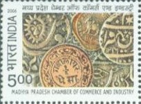 A listing of postage stamps of India depicting coins.