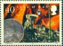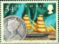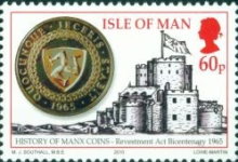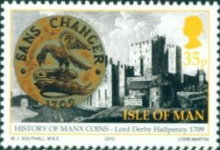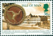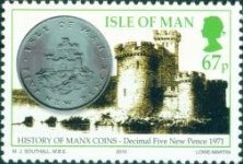 A listing of postage stamps of Isle of Man depicting coins.