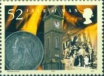 34-, 39-, 40-, and 52-pence postage stamps depict coins.