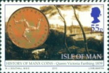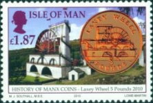 35-pence stamp depicts 1709 Derby 1/2-penny coin; 36-pence stamp depicts Matthew Boulton cartwheel penny; 55-pence stamp depicts Victorian Manx farthing; 60-pence stamp depicts 1965 gold coin; 67-pence stamp depicts 1971 5-pence coin; 1.87-pound stamp depicts Manx 2010 5-pound coin.