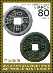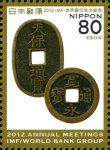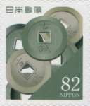 84-yen stamp depicts Japan 7th-10th century Wadokaichin coin.