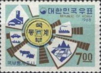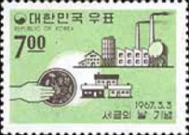 7-won stamp depicts a Korean coin.
