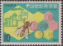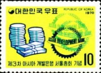 10-won postage stamp depicts stacks of coins.