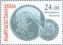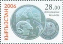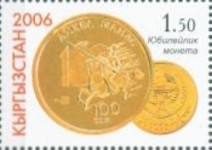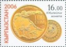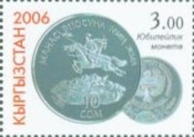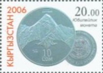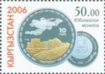 50-som stamp depicts 10-som coin; 100-som stamp depicts a 10-som coin; 100-som stamp depicts Kyrgyzstan 1-, 3-, and 10-som coins.