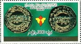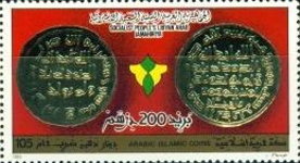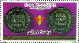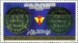 200-dirham stamp depicts a coin of Hegira 105; 200-dirham stamp depicts a coin of Hegira 91; 200-dirham stamp depicts a coin of Hegira 77; 300-dirham stamp depicts a dinar coin from Zuela.