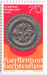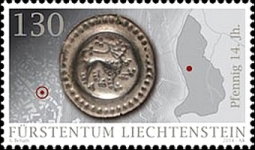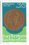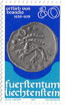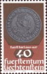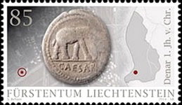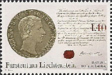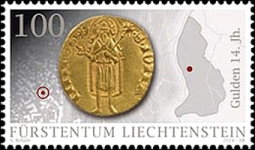A listing of postage stamps of Liechtenstein depicting coins.