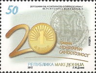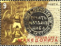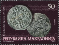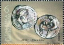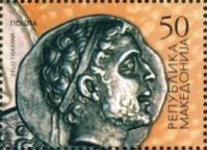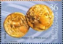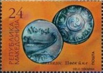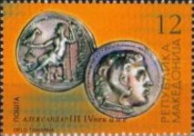 6-denar stamp depicts King Lykkeios of Paeonia obol of 359-340 B.C.; 12-denar stamp depicts Alexander III tetradrachm; 24-denar stamp depicts King of Macedon tetrobol of 185-165 B.C.; 36-denar stamp depicts Philip II of Macedon gold stater; 50-denar stamp depicts Kings of Macedon coin.