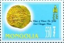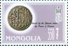 Three 550-tugrik postage stamps depict coins of the Mongolian empire.