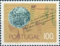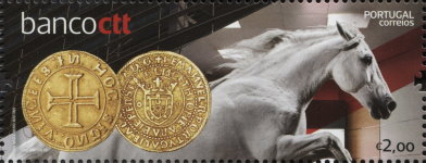 'N' denomination stamp depicts dinheiro coin of 1143-1185; 'A' denomination stamp depicts gold morabitino coin of 1185-1211; 'E' denomination stamp depicts gold tornīs coin of 1279-1325; 'I' denomination stamp depicts gold justo coin of 1481-1495.