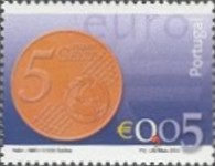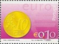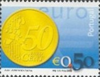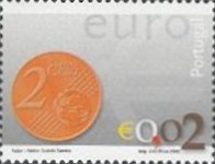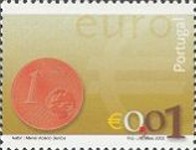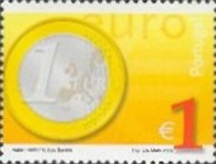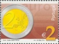 47-cent stamp depicts three stylized euro coins; 1-euro stamp depicts two stylized euro coins.