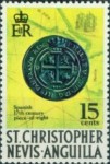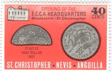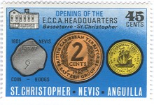 A listing of postage stamps of Saint Kitts-Nevis depicting coins.