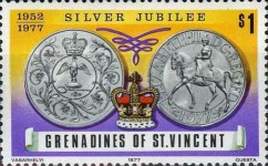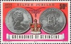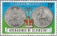 25-cent stamp depicts coronation crown coin; 50-cent stamp depicts silver wedding coin; $1 stamp depicts silver jubilee coin.