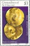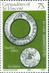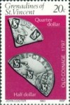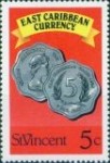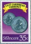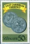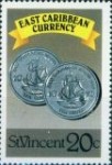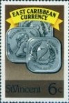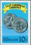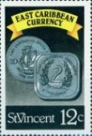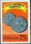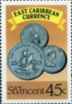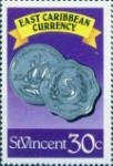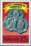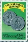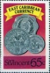 5-, 6-, 10-, 12-, 15-, 20-, 25-, 30-, 35-, 45-, 50-, 65-, 75-cent postage stamps depict East Caribbean coins.