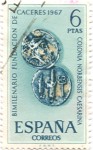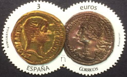 3-peseta stamp depicts coin of Caesar Augustus; 7-peseta stamp depicts a coin.