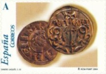 "A" (27-cents) postage stamp depicts ancient Roman coins of Jaca.