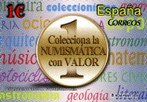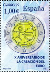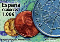 1-euro stamp depicts USA 10-cent coin, USA 1-cent coin, and Spain 100-peseta coin.