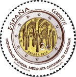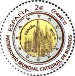 2-euro stamp depicts 2-euro coin which depicts Burgos Cathedral.