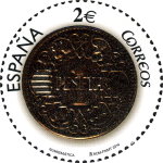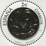 2-euro stamp depicts the reverse of a Spain 1927 25-centimo coin.