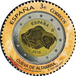 3-euro stamp depicts coin of cave painting in Altamira cave.
