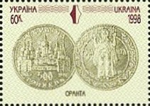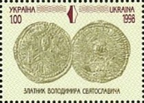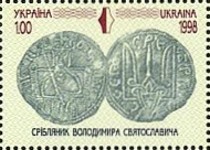 80-kopiyka stamp depicts silver coin of Prince Volodymyr Sviatoslavovych.