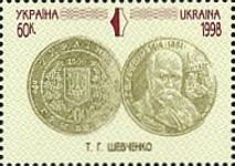 60-kopiyok stamp depicts 200-hryvnia Taras Shevchenko gold coin;