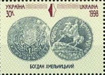 30-kopiyok stamp depicts 1,000,000-kopiyok Bohdan Khmelnytsky silver coin;
