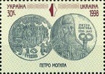 30-kopiyok stamp depicts 10-hryvnia Petro Mohyla silver coin.
