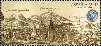 2.50-hryvnia postage stamp depicts the city of Lviv and a coin.
