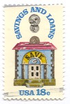 18-cent postage stamp shows three US coins (buffalo five cent, Barber ten cent, Indian head one cent) dropping into a savings bank.
