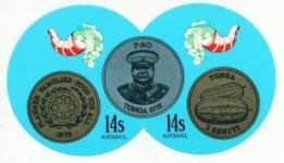 Two 10-cent postage stamps depict 1875 one-cent coin, undated one-dollar coin, undated 25-cent coin, and undated $20 coin.