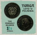 32 seniti on 12-seniti airmail postage stamp depicts 75-pa'anga coin depicting Queen Salote III.