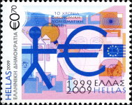 47-cent stamp depicts three stylized euro coins; 1-euro stamp depicts two stylized euro coins.