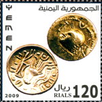 50-, 60-, 70-, 80-, 100-, and 120-rial postage stamps depict ancient coins.